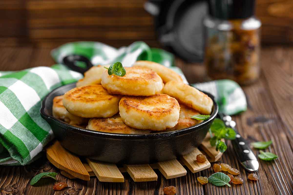 Pannā uzkarsē eļļu. Lēzenā šķīvī ieber vēl nedaudz miltu. Ar ūdenī samērcētu karoti ņem biezpiena masu, liek miltos un uzmanīgi apviļā no visām pusēm, veidojot "sirņika" formu. Notrauc liekos miltus un liek pannā, cepot, līdz plācenīši ir zeltaini no abām pusēm. |
