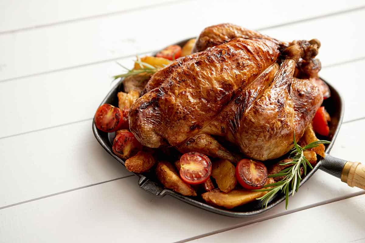 Vistu un kartupeļus cep ~1 stundu. Ik pa 15 minūtēm apgroza un apziež ar eļļu un cepeša šķidrumu. Gatavai vistai jābūt ļoti mīkstai, gaļai viegli jāatdalās.