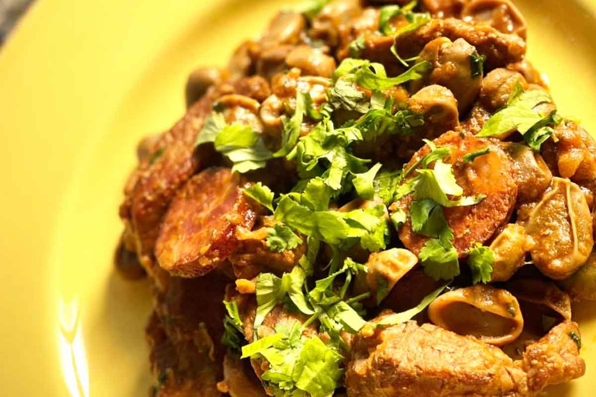 Liekam traukā apceptās ribiņas, cūkupupas un šķēlītēs sagriezto chouriço (desu), pievienojam buljonu un liekam uz lēnas uguns sutināties līdz cūkupupas mīkstas |