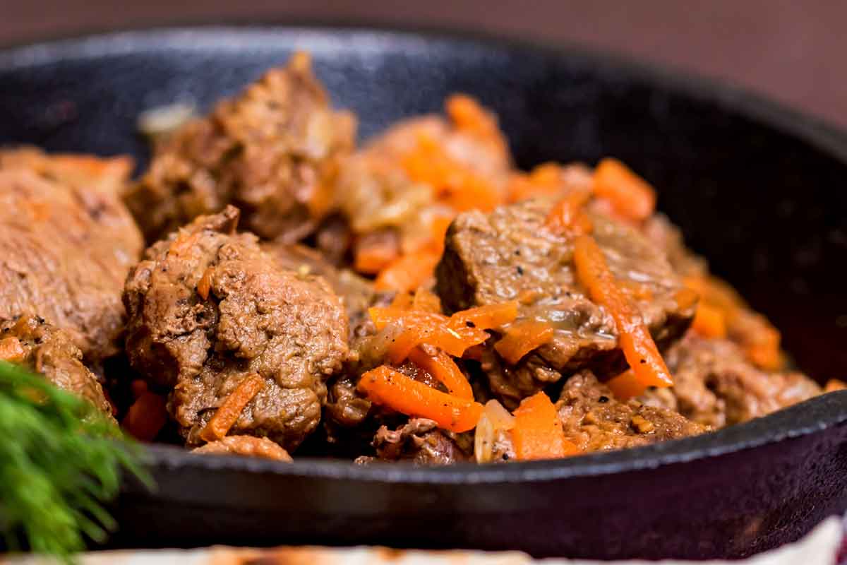 Gaļas mīkstumu sagriež apmēram 30 g smagos kubveida gabaliņos, tos liek sakarsētos taukos un apcep brūnus. Cepšanas beigās pievieno piparus, sāli, tomātu biezeni.