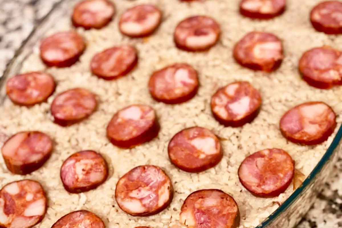 Cepamtraukā liekam pusi no rīsiem, tad pīles gabaliņus, atlikušos rīsus un virsū izkārtojam chouriço ripiņas. |