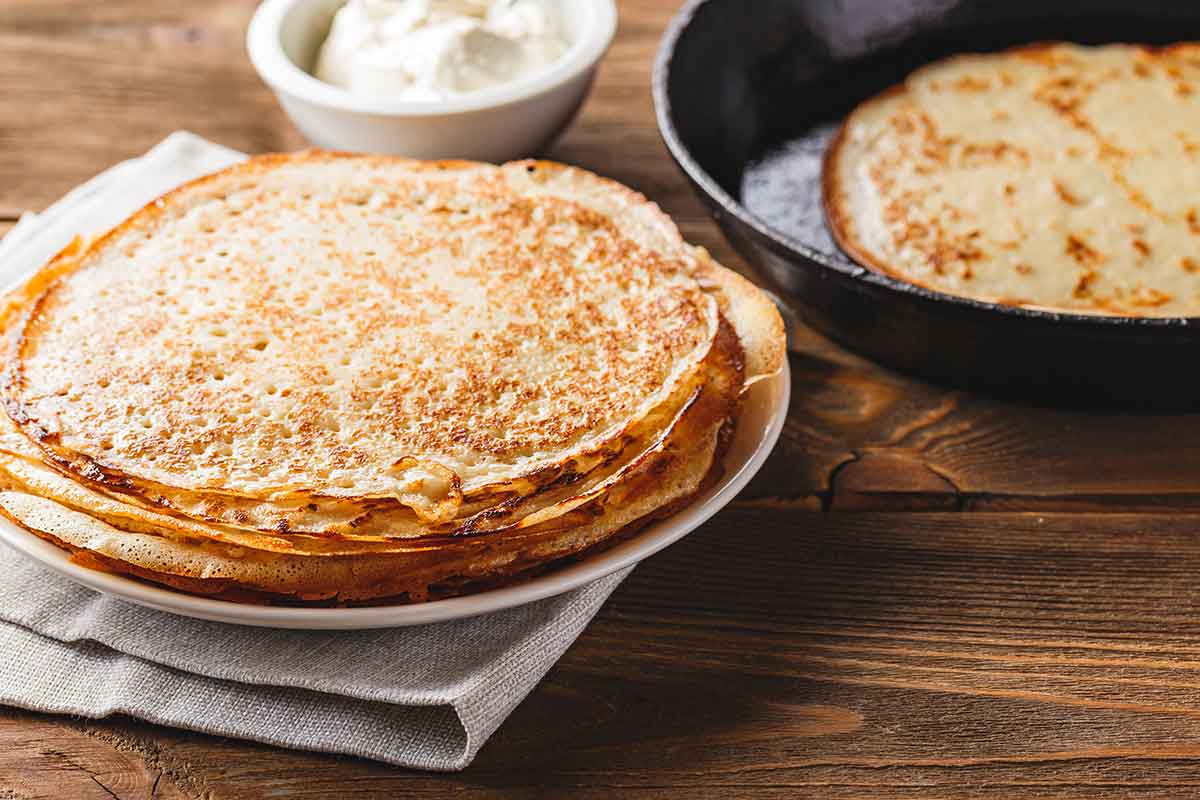 Pankūkas var pasniegt ar laša ikriem kopā ar krējumu loku mērci.