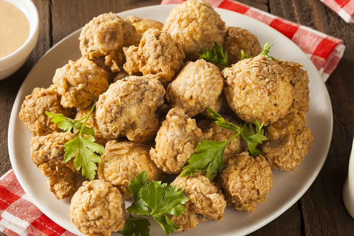 Sēnes uzdur uz dakšiņas, iemērc mīklā un liek uz pannas cepties sakarsētā eļļā. |